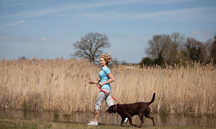 A woman jogs in the countryside with her dog. Photograph: Alamy