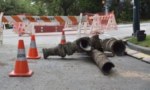 FacebookTwitterPinterest Unearthed pipes lie on Vancouver’s East 12th Avenue, which is undergoing construction to replace a water main on 14 July 2019. Photograph: Mackenzie Lad/AP